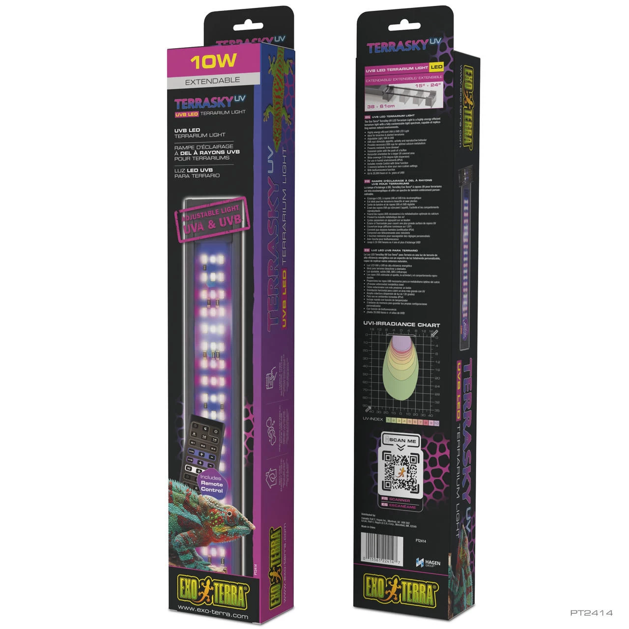 The Exo Terra TerraSky UV LED Terrarium Light is a highly energy efficient terrarium light with a fully customizable light spectrum, capable of replicating various natural environments. The high intensity, horizontal orientation, and wide beam angle of the TerraSky UV LED ensures that a larger area is covered with optimal Light, UVA and UVB rays. The high light intensity in combination with UVA rays stimulate the animal’s appetite, activity, and reproductive behavior. UVA also reduces stress and contributes to the animal’s overall wellbeing.