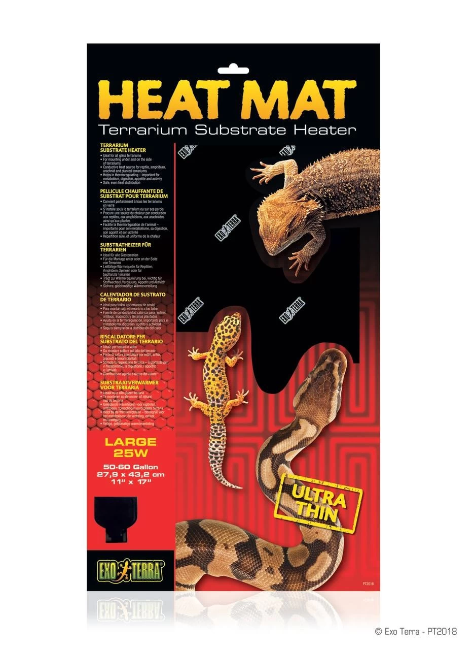 Reptiles and amphibians are cold-blooded and in their natural habitat they often use surfaces heated by the sun to warm up. The Exo Terra Heat Mat is a terrarium substrate heater that simulates these surfaces heated by the sun. Exo Terra’s Heat Mats are an ideal 24-hour primary or secondary heat source for tropical or temperate reptile and amphibian species and essential as a nighttime heat source for many desert species. The Exo Terra Heat Mat permanently adheres to the terrarium, forming a solid bond for optimal heat transfer. Can be used with an Exo Terra Thermostat and/or in conjunction with additional heat sources for higher temperature species.