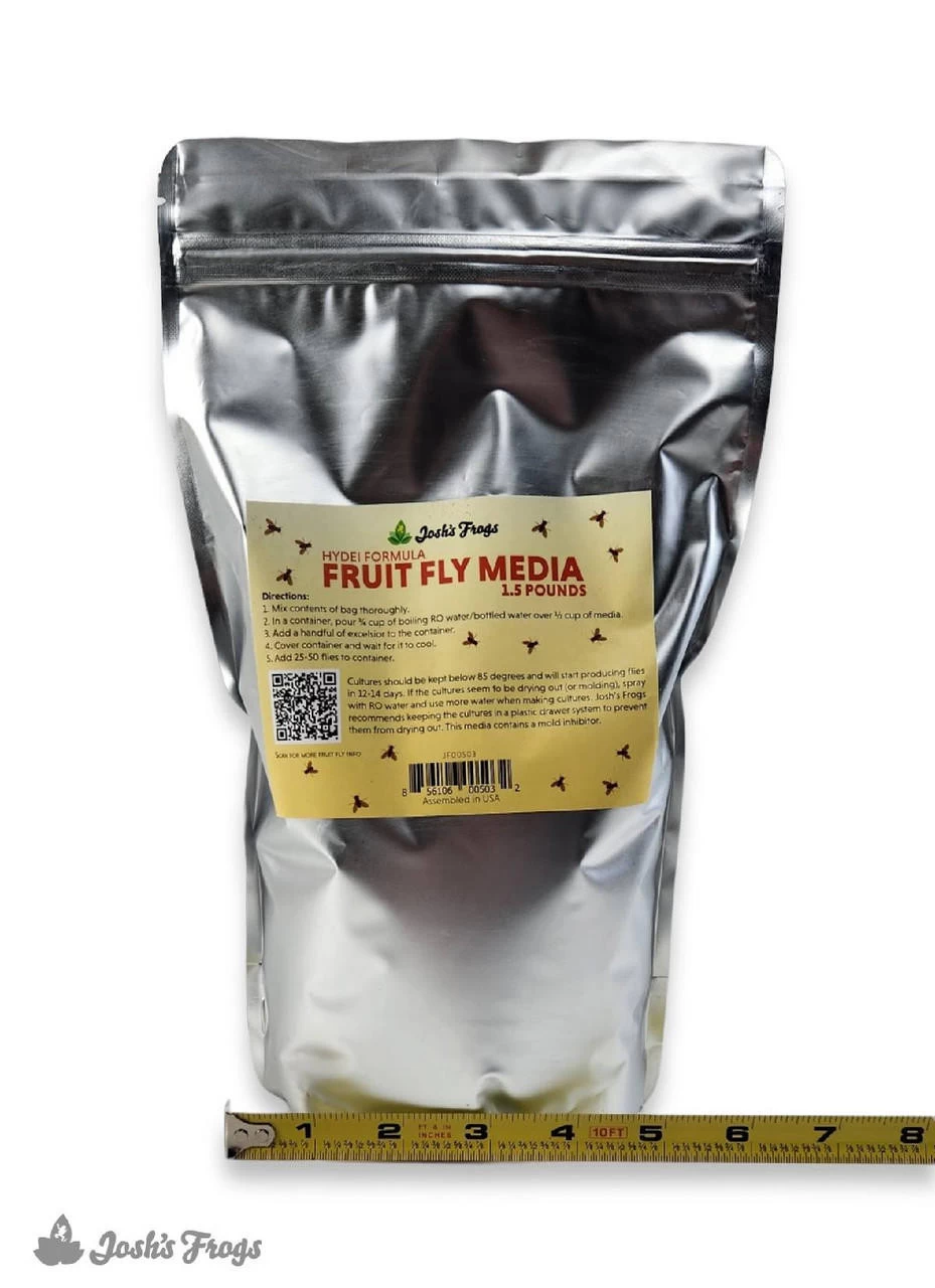 Josh’s Frogs Hydei Fruit Fly Media is the best in the industry! Since 2004 we’ve produced over 80 TONS of fruit fly media! Each bag of Hydei Fruit Fly Media contains 5+ cups of fruit fly media. A bag of Hydei Fruit Fly Media makes 15 – 1/3 cup cultures or 10 – 1/2 cup cultures.