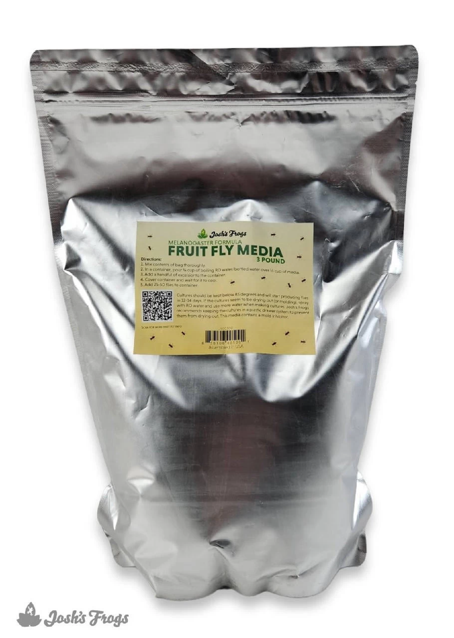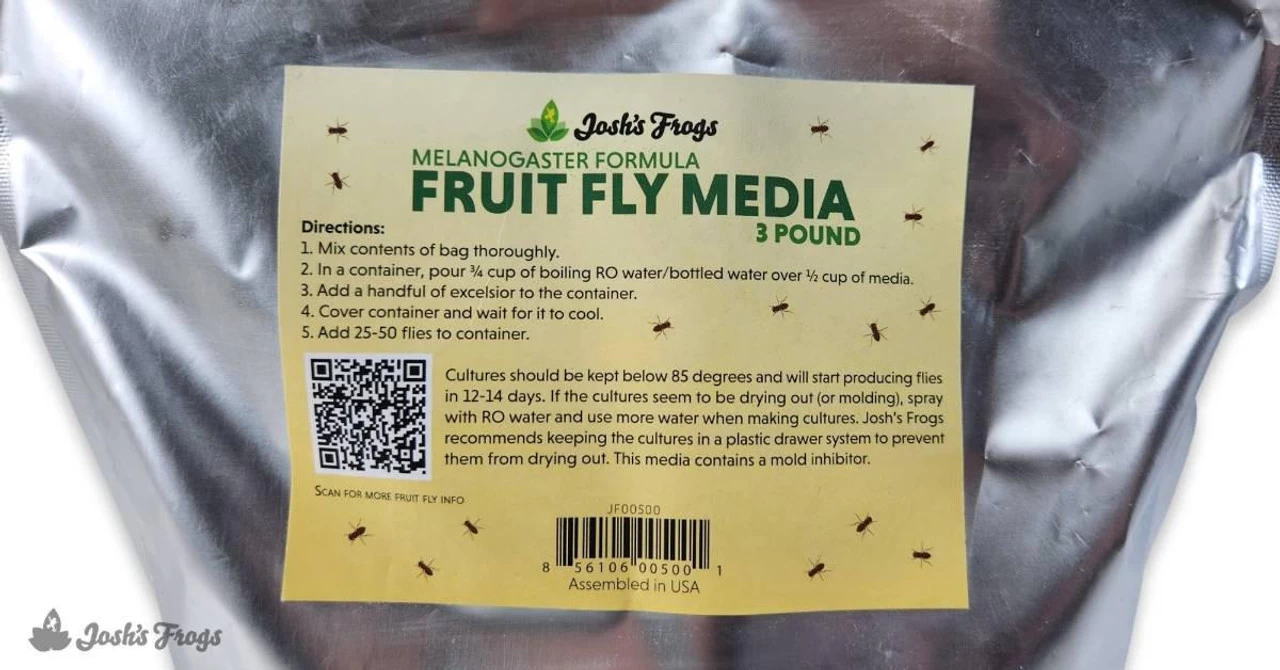 Josh’s Frogs Melanogaster Fruit Fly Media is the best in the industry. Each bag of Josh’s Frogs Melanogaster Fruit Fly Media contains 10+ cups of fruit fly media. A bag of Josh’s Frogs Melanogaster Fruit Fly Media makes 30 – 1/3 cup cultures or 20 – 1/2 cup cultures.