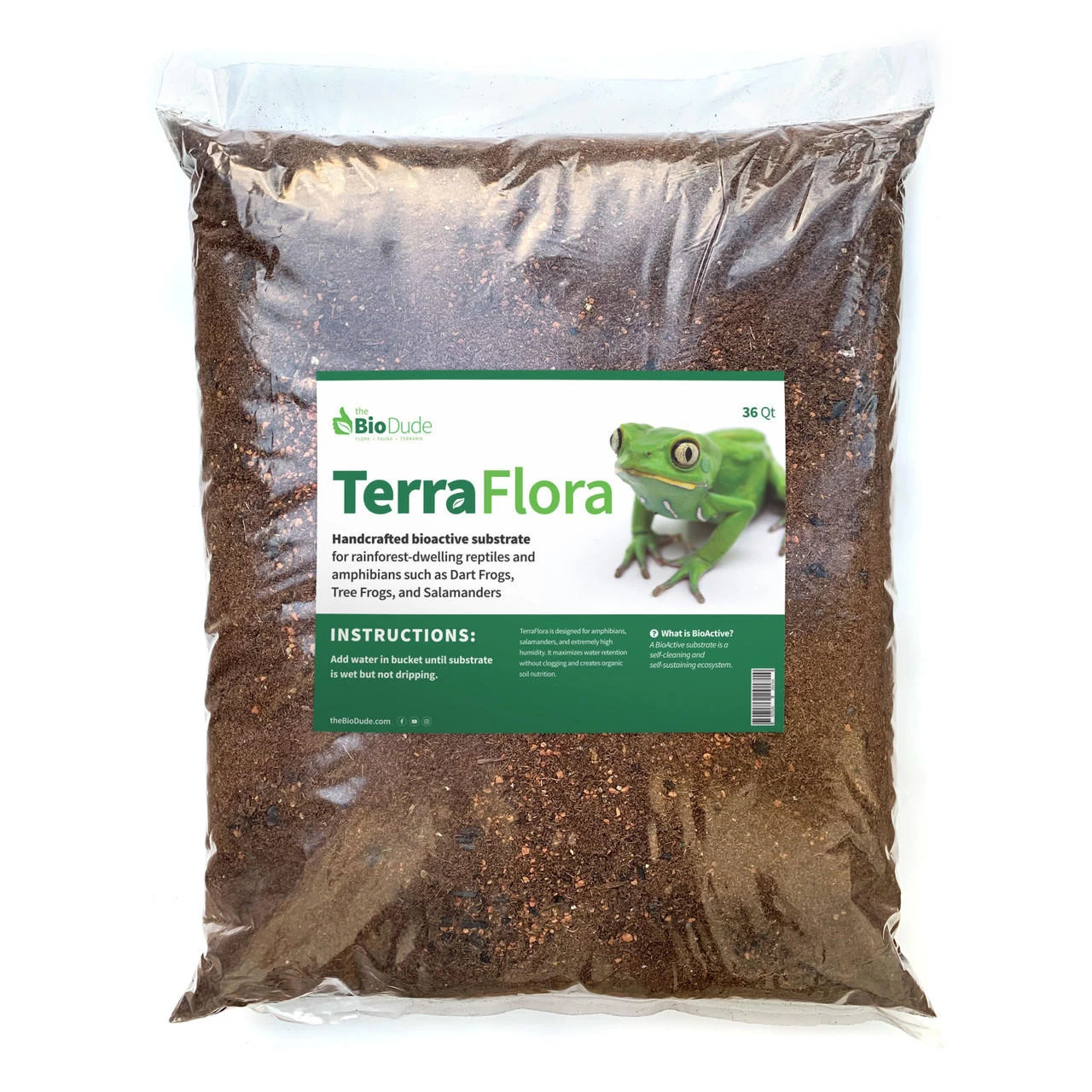 The BioDudes handcrafted bioactive substrate for rainforest-dwelling reptiles and amphibians such as Dart Frogs, Tree Frogs, and Salamanders This substrate is specifically designed for biomes that can get very humid and stagnant. Terra Flora is designed to hold the perfect amount of water and allow any excess to pass directly through it into the drainage layer. Terra Flora provides excellent organic nutrition for your vivarium by creating necessary air pockets for root development and plant health. These air pockets are also necessary for the springtails and isopods to create a sustainable population in the vivarium.